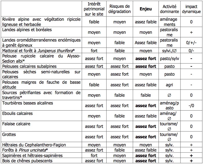 Les enjeux ne mettent pas en évidence de grands types de milieux sur lesquels un enjeu fort ou très fort serait une thématique marquante dans la gestion future du site. Chacun de ces habitats devra donc être l'objet de préconisations de gestion spécifiques dont la hiérarchisation des priorités sera fonction de l'enjeu sur l'habitat.