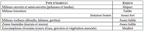 Les enjeux ont été regroupés par grandes catégories d'habitats pour lesquels les problématiques (type d'activité, nature des menaces...) sont plus ou moins comparables :